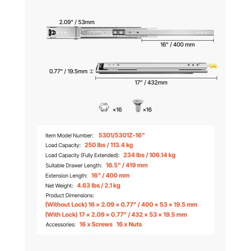 VEVOR 1 Paio di Guide per Cassetti a Estensione Completa, Capacità di Carico 113,4 kg, Guide per Cassetti con Bloccaggio, Cuscinetti a Sfera con Guida Scorrevole Serratura 432 x 53 x 19,5 mm