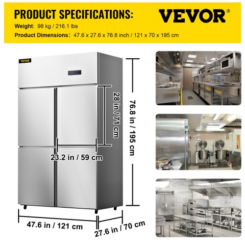 VEVOR Frigorifero Americano da 121 x 70 x 195 cm, Frigo da 4 Porte in Acciaio inox Volume da 780L, con compressore da 272 W per Basso Rumore, Uso per Negozi, Ristoranti, Hotel e Fabbriche Alimentari