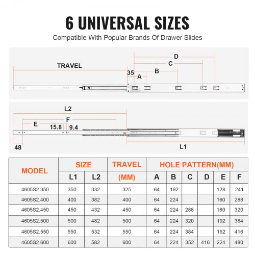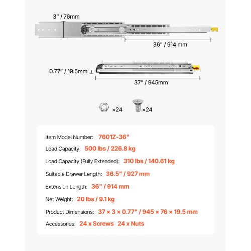 VEVOR Guida Scorrevole per Cassetti 6 Paia, Guide per Cassetti con Sfera 609,6mm Carico max. 45,4kg, Guida Cassetto Estraibile Laterale Estensione Completa Ripiano dell'Armadio, Set di Guida Cassetti