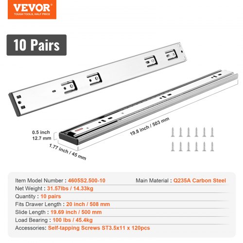 VEVOR Guida Scorrevole per Cassetti 10 Paia, Guide per Cassetti con Sfera 609,6 mm Carico 45,4 kg, Guida Cassetto Estraibile Laterale Estensione Completa Ripiano dell'Armadio, Set di Guida Cassetti