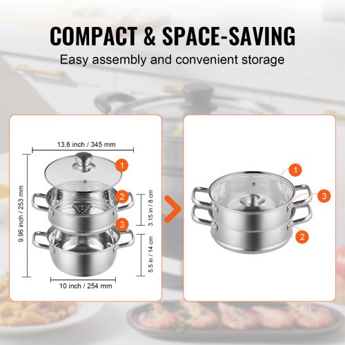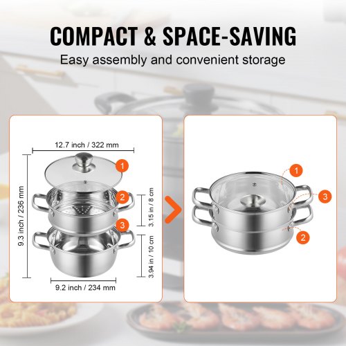 VEVOR Pentola a Vapore Ripiano Singolo Pentola Vaporiera 22 cm Capienza Circa 2,8 Litri, Vaporiera Multicottura in Acciaio Inox per Alimenti Coperchio in Vetro, Vaporiera Multifunzionale con Coperchio
