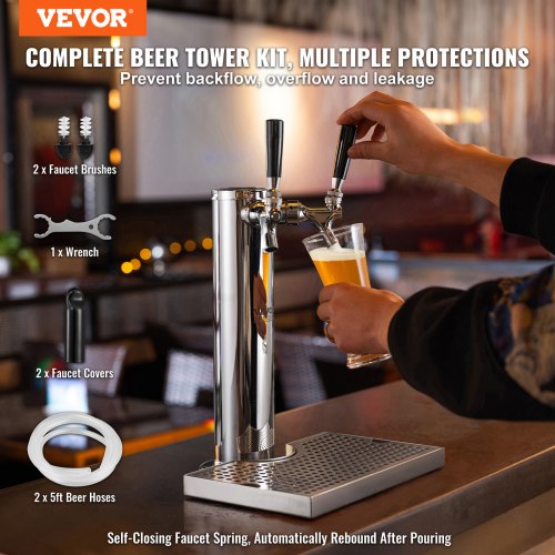 VEVOR Dispenser a torre per birra alla spina con doppio rubinetto, Torre per birra in fusti in acciaio inox, Kit spillatore birra artigianale rubinetti a chiusura automatica per feste, bar