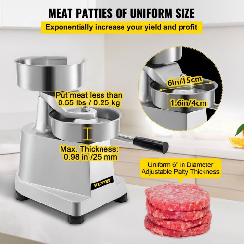 VEVOR Macchina Manuale Hamburger Commerciale, Macchina per Hamburger con 3 Stampi Convertibili (2/4/5 pollici), Pressa per Hamburger Manico Materiale Alimentare Formatura Carne Capacità max. 1,5 kg