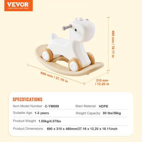 VEVOR Cavallo a Dondolo 3 in 1, Cavalluccio a Dondolo per Bambini da 1 a 3 Anni, con Tavola di Equilibrio Rimovibile 4 Ruote Lisce, Supporta Fino a 36 kg Materiale HDPE, Oscillazione a 40° Bianco