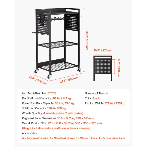 VEVOR Carrello Portautensili a 4 Ripiani, Capacità di Carico 68 kg Carrello Porta Attrezzi con Ruote per Trapano e Rastrelliera di Stoccaggio Stabile, per Impieghi Gravosi per Officina, Garage, Nero