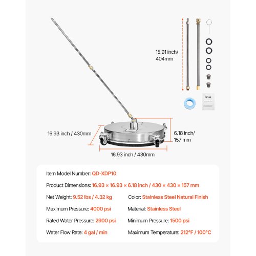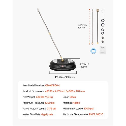 VEVOR Idropulitrice per Superfici in Plastica con 4 Ruote, 206,8 bar Max, Connettore Rapido da 1/4, 2 Ugelli a Spruzzo, 2 Lance Estese, per Cemento, Patio, Marciapiede, 385 mm, Nero