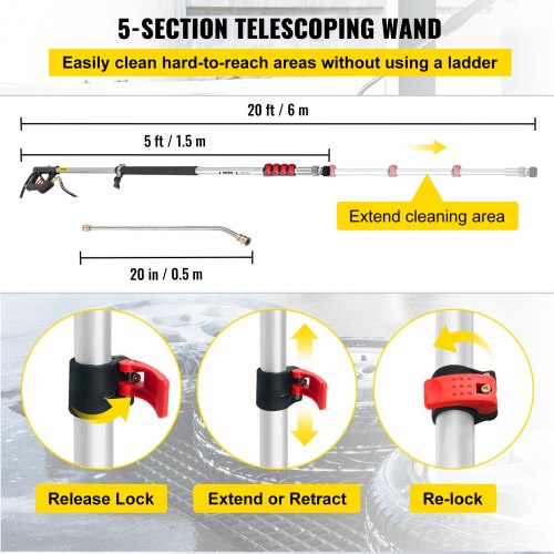 VEVOR Bacchetta di Prolunga Telescopica 4000PSI Bacchetta per Pulire a 1,5-6m con 5 Ugelli a Spruzzo Bacchetta Telescopica 9GPM per il Vialetto, il Marciapiede, la Piscina, il Portico, il Patio, ecc.