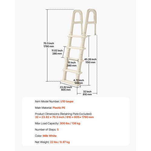 VEVOR Scala per Piscina, Scale con Corrimano Doppio a 4 Gradini Antiscivoli, Capacità 181,4 kg, per Piscine Interrate e Fuori Terra da 122-137 cm, Qualsiasi Superficie di Pavimentazione, Tortora