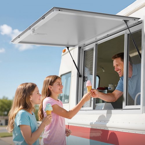 VEVOR Finestra per Camion di Cibo 915 x 610 mm, Finestra Servizio in Lega Alluminio, Finestra Girevole Fino a 29° con 2 Finestre Scorrevoli e Porta con Tendalino Gancio di Traino, per Camion di Cibo