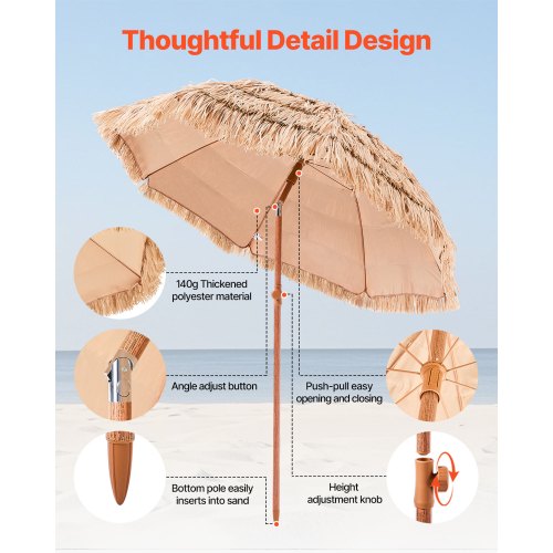 VEVOR Ombrellone da Spiaggia in Paglia 1828 mm Inclinabile, Ombrellone da Esterno Spiaggia Giardino Stile Hawaiano di Paglia in PP Pieghevole Parasole di Paglia per Cortile Piscina Giardino