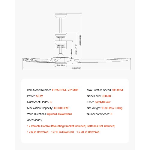 VEVOR Ventilatore da Soffitto Senza Luce da 180 cm Moderno Ventilatore Esterno a Filo a Basso Profilo, Telecomando a 6 Velocità, 3 Pale in Legno, Motore CC Reversibile, per Soggiorno e Patio, Nero