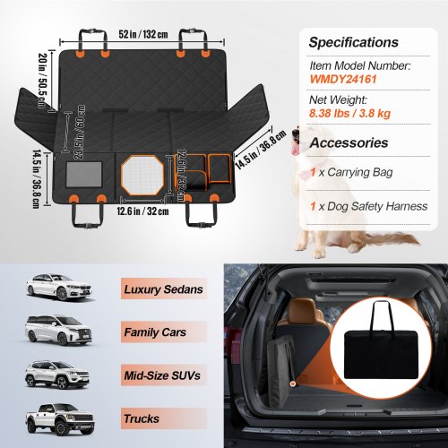 VEVOR Estensione per Sedile Posteriore per Cani, Amaca per Cani Coprisedile per Cani con Fondo Rigido Sedile Posteriore 1310 x 630 mm, 158,7 kg, con Finestra a Rete e Tasca Portaoggetti per Auto, SUV