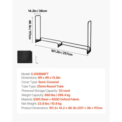 VEVOR Rack di Legna da Ardere Esterni Scaffale Porta-Legna da 244,5x36,2x122 cm, Capacità da 590 kg Legna da Ardere Log Rack in Acciaio Nero, Impilatore di Legno Scaffale Uso in Fattoria, Cortile