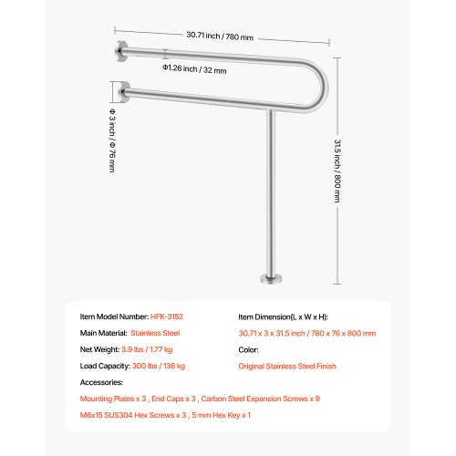 VEVOR Corrimano di Sicurezza per WC, Carico di 136 kg Barra di Sostegno per Disabili a Forma di U da 800 mm Asta di Sicurezza per Anziani in Acciaio Inox, con Maniglia Antiscivolo, Gamba di Supporto