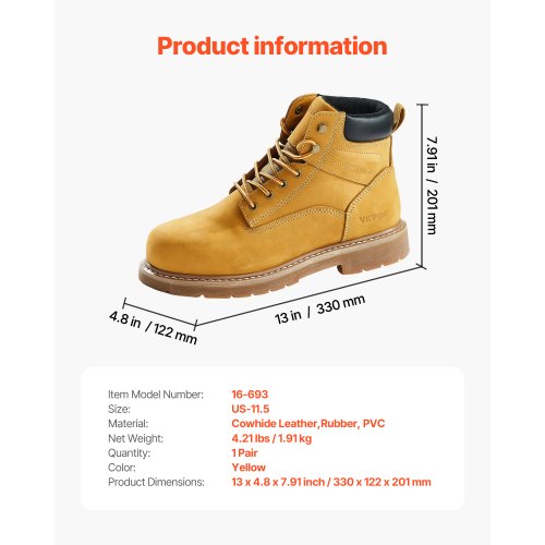 VEVOR Stivali da Lavoro con Punta in Acciaio, Taglia US 11, Stivali Lavoro Impermeabili, Scarpe da Lavoro Antiscivolo con Suola in Gomma Leggeri e Traspiranti per l'Industria Edile, Marrone Giallo