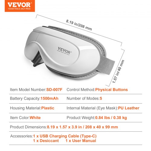 VEVOR Massaggiatore per Gli Occhi con Calore, Maschera per Massaggio degli Occhi Riscaldata, 5 Modalità, Musica Bluetooth, per Emicranie, Affaticamento degli Occhi, Regalo Ideale per Genitori, Bianco