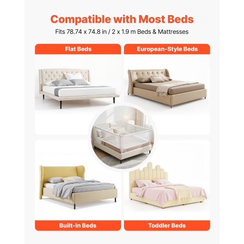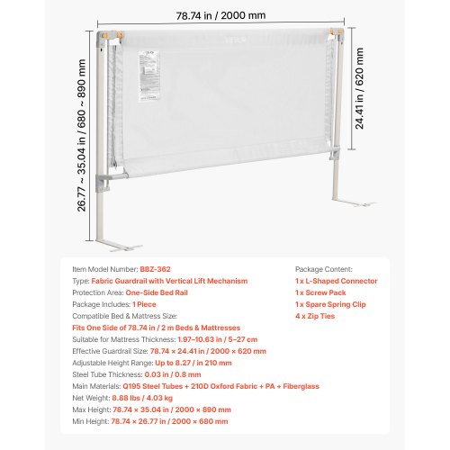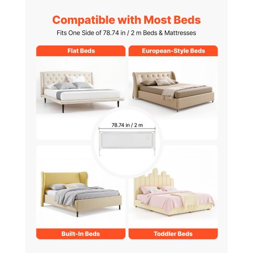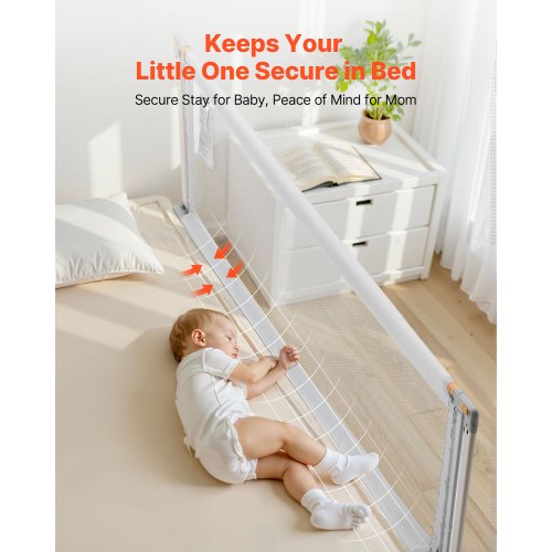 VEVOR Sponda per Letto per Bambini Lunghezza 2 m, Barriera per Lettino per Neonati con Tubo di Ferro Rinforzato, Tessuto Oxford, Altezza Regolabile 68-89 cm, per Materassi di Spessore 5-27 cm