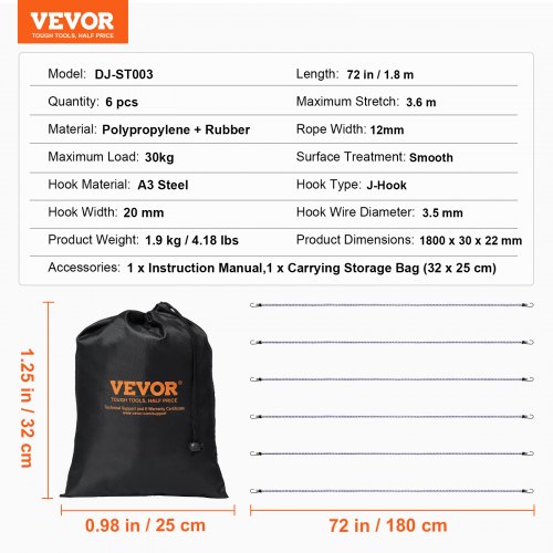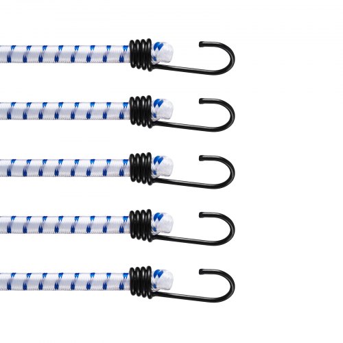 VEVOR Corde Elastiche con Ganci in Acciaio A3, Cinghie Elastiche Resistenti da 1,8 m Set di Corde Elastiche 12 mm per Campeggio, Teloni, Motociclette, Camion, Tende, Bianco con Strisce Blu, 6 Pezzi