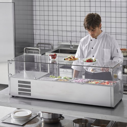 VEVOR Stazione di Preparazione Refrigerata per Condimenti da Banco 140 W Stazione di Preparazione per Frigorifero con 1 Vaschetta 1/3, 4 Vaschette 1/6, Corpo in Acciaio Inossidabile 304, Coperchio PC