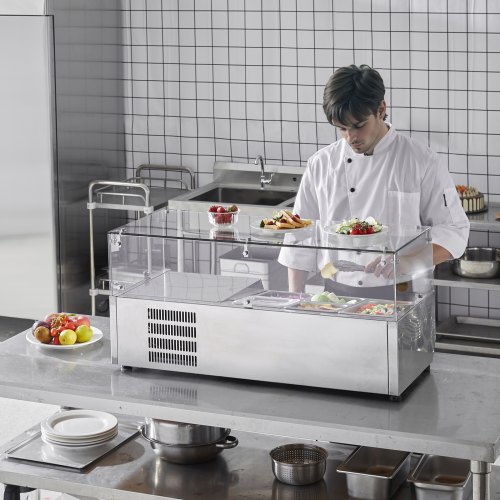 VEVOR Stazione di Preparazione Refrigerata per Condimenti da Banco con 2 Vaschette 1/3, 4 Vaschette 1/6, Stazione di Preparazione per Frigorifero 140 W Corpo in Acciaio Inossidabile 304, Coperchio PC