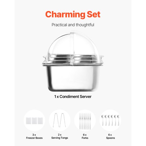 VEVOR Contenitore Espositivo per Servire Cibo da Banco, Vassoio per Servire Cibo in Acciaio Inox 5 Teglie, Espositore per Dispensatori di Condimenti a Buffet con 3 Contenitori per Congelatore