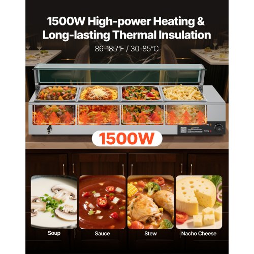 VEVOR Scaldavivande Commerciale con 8 Recipienti (8,8 L / 1/2 Dimensioni Ciascuno) Tavolo a Vapore Elettrico con Copertura in Vetro 1700 W Scaldavivande da Tavolo, Controllo della Temperatura 30-85 °C