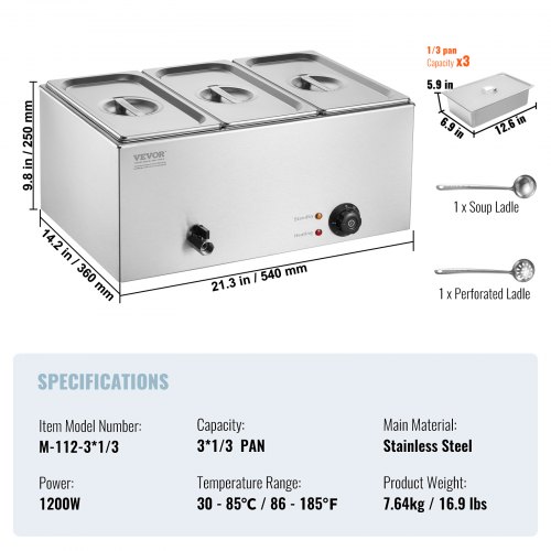 VEVOR Scaldavivande Commerciale Contenitore per Alimenti 16,5 L Piastra Riscaldante Elettrica 3 x 1/3 Dimensioni, 1200 W Scaldavivande da Tavolo in Acciaio Inox 30-85 °C Controllo della Temperatura