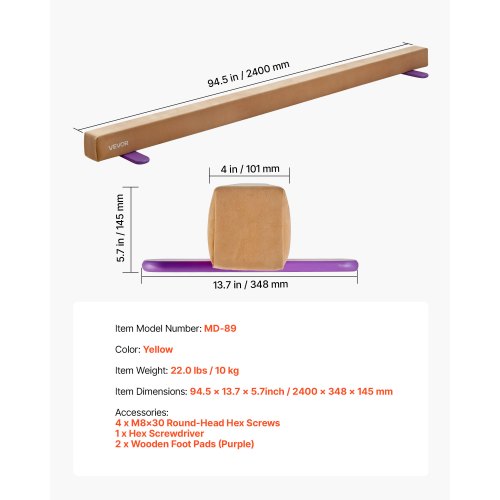 VEVOR Trave di Equilibrio per Ginnastica per Bambini, Pieghevole 2400 mm Capacità di Carico 158,75 kg, con Tappetino Antiscivolo, Trave di Equilibrio con Anima in Legno, per Casa e Palestra, Giallo