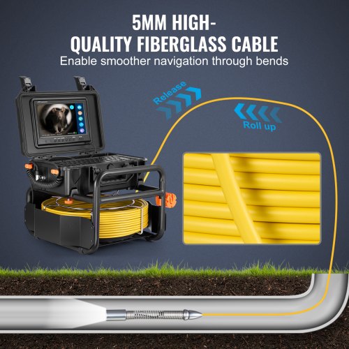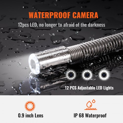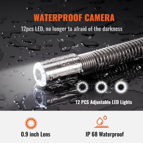 VEVOR Telecamera per Ispezione Tubi 50 m Endoscopio per Scarichi con Schermo da 7'', Funzione DVR, Impermeabile IP68, 12 LED Orientabili, Scheda SD 16 GB, Cavo Semirigido per Condutture, Fognature