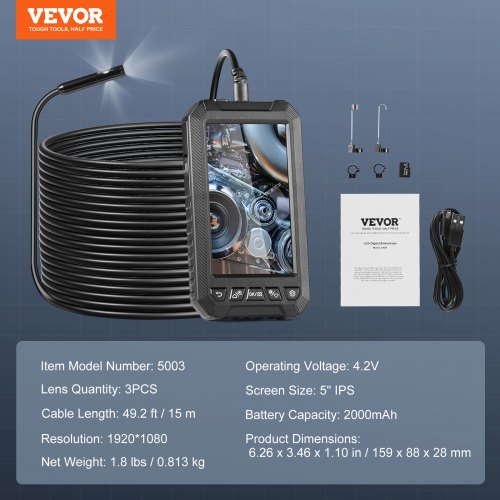 VEVOR Telecamera a Endoscopio Lente Tripla con Schermo di Controllo Batteria 2860 mAh Cavo 5m, Telecamera di Ispezione a Endoscopio Obiettivo Rotante Lente Sostituibile Risoluzione 1920x1080 Portatile