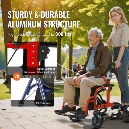 VEVOR Deambulatore 2 in 1 e Sedia da Trasporto per Anziani, Deambulatore per Disabili in Alluminio Leggero con Maniglia Regolabile, Ruote per Tutti i Terreni, 136 kg