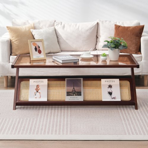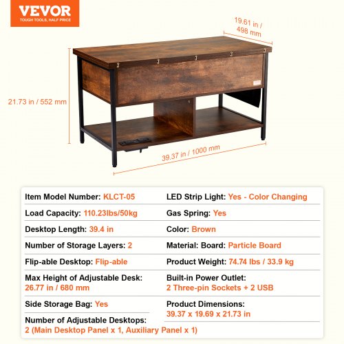 VEVOR Tavolino Sollevabile, Tavolino Rettangolare da 1206 mm con Tasche Portaoggetti Extra, Tavolino Pop-Up per Soggiorno Tavolino da Pranzo Regolabile Altezza, Tavolino caffè per Bar Casa, Marrone