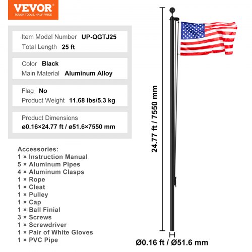 VEVOR Kit Asta Bandiera Telescopica da 762 cm in Lega di Alluminio Resistente nel Terreno per Esterni, con 3 Modalità di Visualizzazione con Accessori Professionali, Asta Bandiera Tedesca, Argento