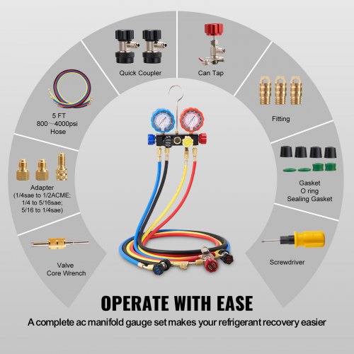 VEVOR Set di Manometro del Refrigeranti a 4 Vie per R134A R410A R22 dell'Aria Condizionata Uso Automobilistico, Set Indicatore del Collettore AC 3 Adattatori per Refrigeranti con Valigetta 31x30x8,5cm