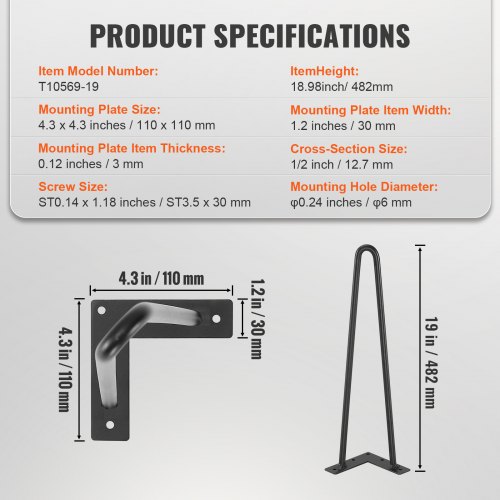 VEVOR Gambe per Tavolo a Forcina da 4 Pezzi con Piastra di Montaggio, Kit di Gambe per Scrivania Lunghezza 40,6 cm in Acciaio Capacità Carico max. 227 kg, Gambe per Mobili per Tavolo da Casa Ufficio