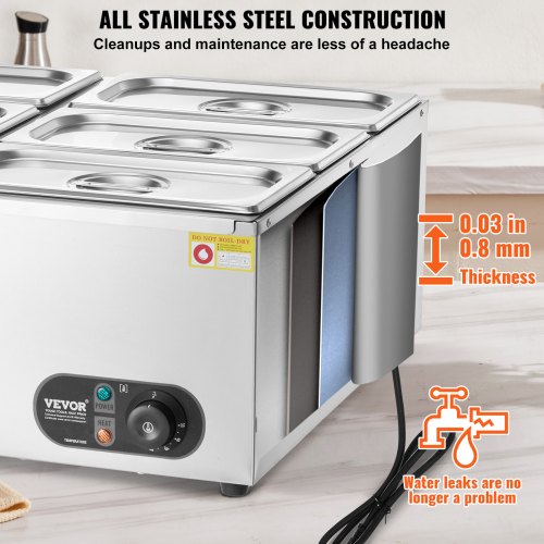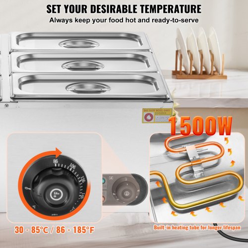 VEVOR Scaldavivande Commerciale 6 x 5,5 L (dimensione 1/3) Scaldavivande Elettrico da Tavolo a Vapore in Acciaio Inox da 1500 W Piastra Riscaldante Elettrica, Controllo della Temperatura da 30-85 °C