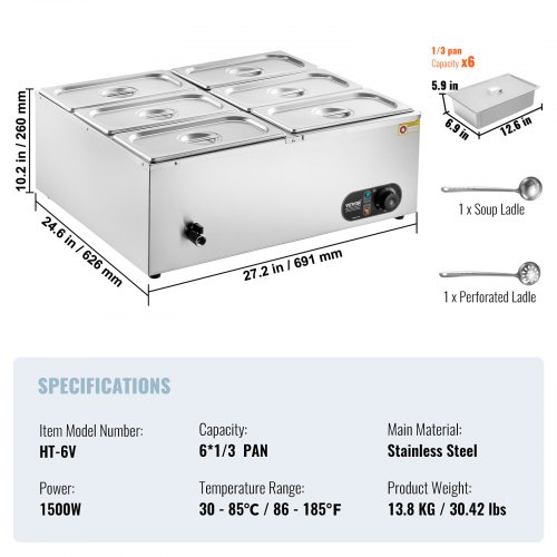 VEVOR Scaldavivande Commerciale, Scaldavivande Elettrico in Acciaio Inox da 1500 W con Coperchio, Bagnomaria da Banco a 6 Teglie con Riscaldamento Rapido e Mestoli Forati, per Ristoranti, Feste