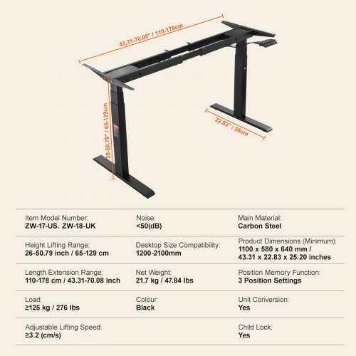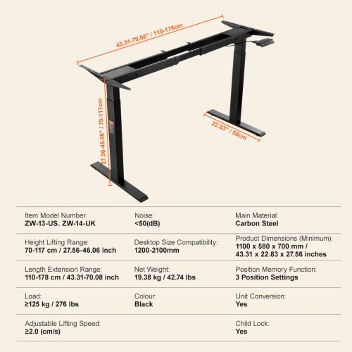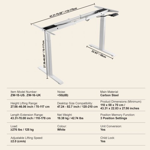 VEVOR Struttura per Scrivania in Piedi Doppio Motore, Altezza Regolabile da 70 a 117 cm Lunghezza da 110 a 178 cm Gambe per Scrivania Elettriche per Computer, per Casa, Ufficio, Solo Telaio, Bianco