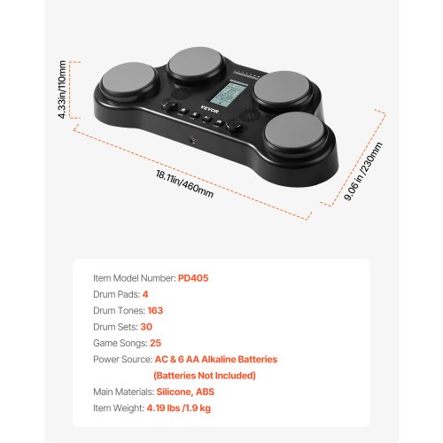 VEVOR Batteria Elettronica, 163 Suoni, Batteria Elettronica da Tavolo con 4 Pad Sensibili alla Velocità, Jack per Cuffie, Altoparlanti Stereo Incorporati, Bacchette 5 A, Pedali, Facile da Trasportare