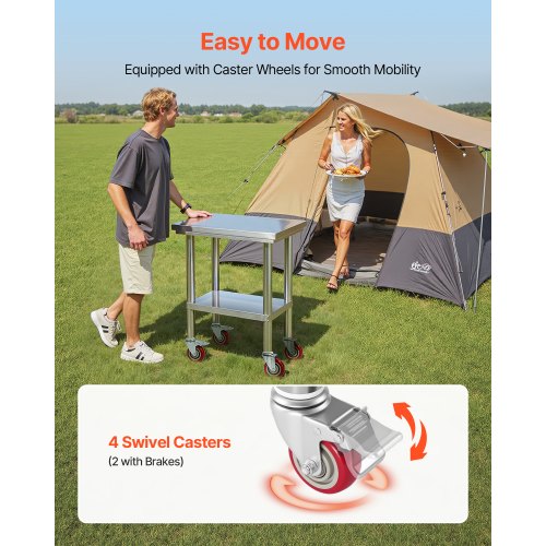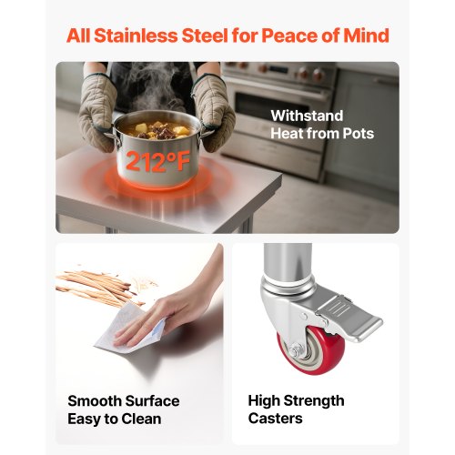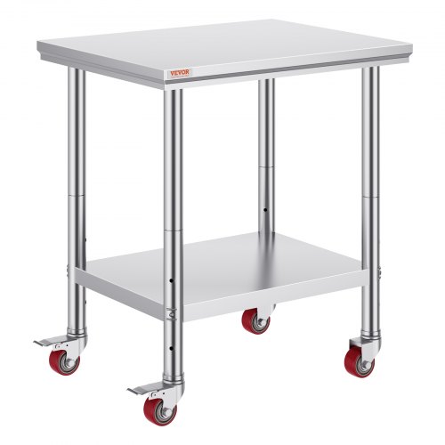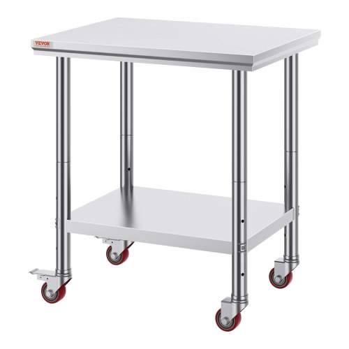 VEVOR Tavolo da Lavoro in Acciaio Inossidabile 610 x 762 x 864 mm, con 4 Ruote, 3 Livelli di Altezza Regolabili, Tavolo Resistente per Preparazione Alimenti Ristoranti Cucina Commerciale, Argento