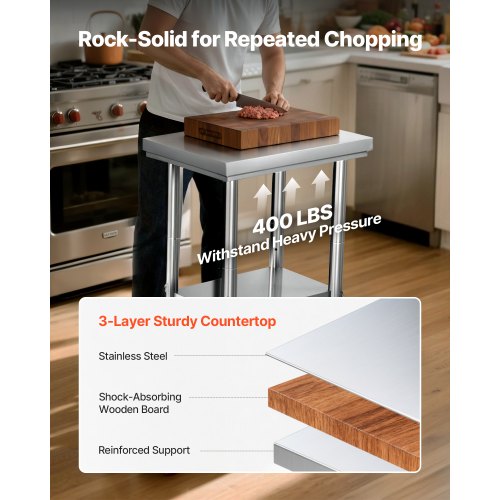 VEVOR Tavolo di Preparazione in Acciaio Inossidabile 610 x 610 x 864 mm Tavolo da Lavoro in Metallo Resistente, 3 Livelli di Altezza Regolabili, Postazione di Lavoro Commerciale per Cucina Cortile
