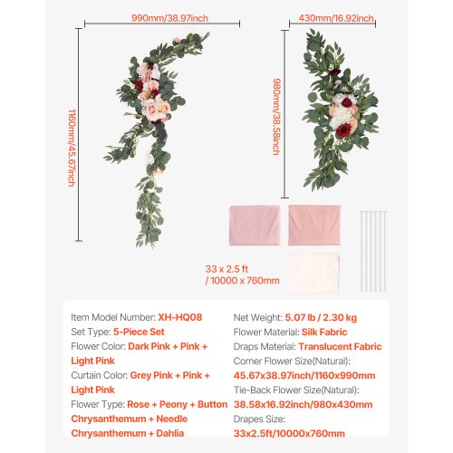 VEVOR Kit di Fiori Artificiali per Arco Nuziale, Fiori Rosa per Arco Nuziale con Kit di Tende, 2 Pezzi Composizione Floreale, 3 Pezzo Tende Trasparenti, per Bouquet Cerimonia Sfondo Ricevimento