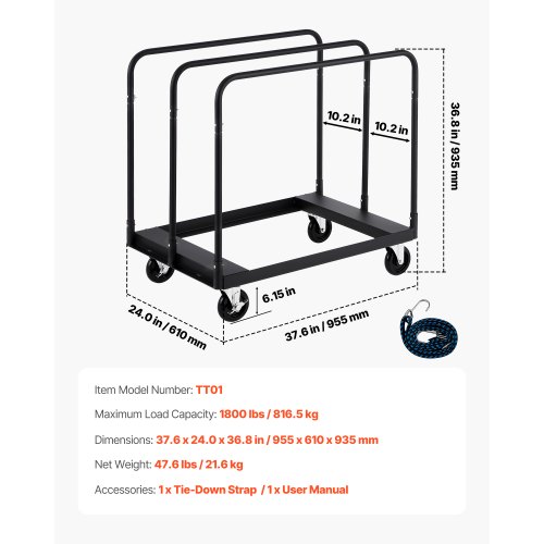 VEVOR Carrello per Cartongesso, Carico 816 kg, Carrello per Pannelli in Acciaio con Ruote da 12,5 mm, per Cartongesso in Legno con Cinghia di Ancoraggio e 3 Corrimano Laterali per Garage, Nero