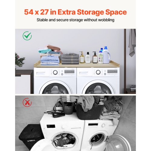 VEVOR Piano di Lavoro per Lavatrice e Asciugatrice con Ripiano a 2 Livelli, 137 x 70 cm Piano per Lavatrice Asciugatrice in Legno con Cuscinetti Antiscivolo, Copertura per Bucato Impermeabile, Nero