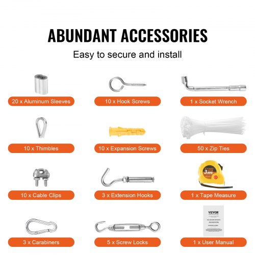 VEVOR Kit di Cavi Metallici da 3,18 mm 30,5 m Cavo in Acciaio Inossidabile 304, 59 Accessori, Resistenza alla Rottura di 2,9 KN Costruzione di Fili 7 x 7 di Grado Aeronautico Marino per Scale, Esterni