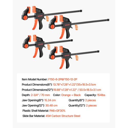 VEVOR Morsetti a Barra per Lavorazione del Legno 4 Pezzi, Apertura 15,24cm 30,48cm, Set di Morsetti Paralleli, Morsetto a F con Limite di Carico 70 kg, Profondità 70 mm, Lavorazione dei Metalli