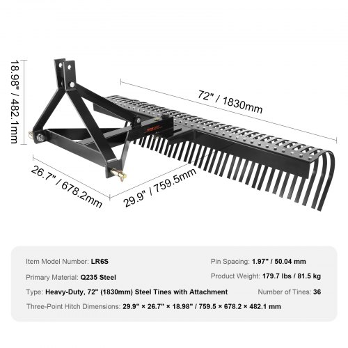 VEVOR Arieggiatore da Traino, Arieggiatore da Traino con Rastrello Arieggiatore Prato a 3 punti, 36 Denti in Acciaio, 1829mm per Trattore, Rastrello Paesaggistico per Giardino, Fattoria, Erba