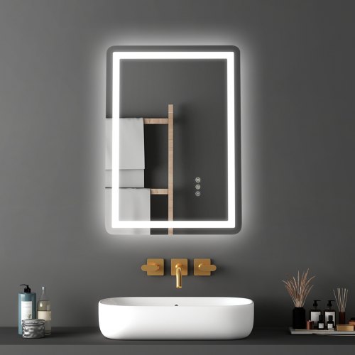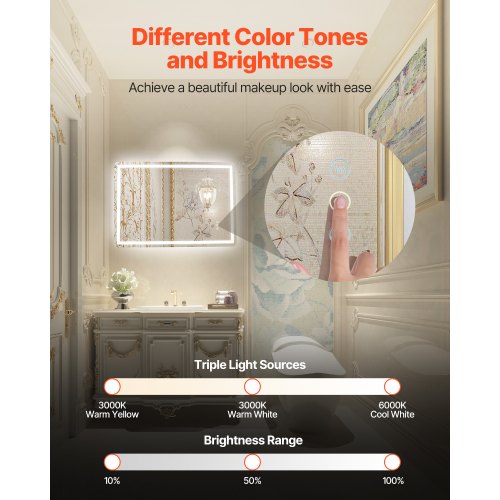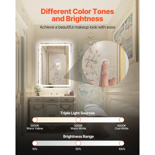 VEVOR Specchio da Bagno a LED 50 x 70 cm Montaggio a Parete con Illuminazione Frontale e Retroilluminata, Specchio Antiappannamento con Memoria con Luci, Specchio Dimmerabile con Temperatura 3 Colori