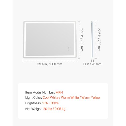 VEVOR Specchio da Bagno a LED 70 x 100 cm Montaggio a Parete con Illuminazione Frontale e Retroilluminata, Specchio Antiappannamento con Memoria con Luci, Specchio Dimmerabile Temperatura 3 Colori