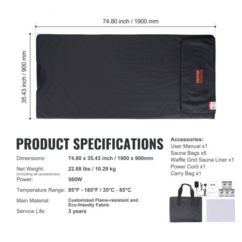 VEVOR Coperta da Sauna Riscaldamento in Fibra di Carbonio Controllo della Temperatura & Timer, Coperta per Sauna a Infrarossi Potenza da 560W a Casa 6 Livelli di Temperatura Regolabile 1800 x 800mm